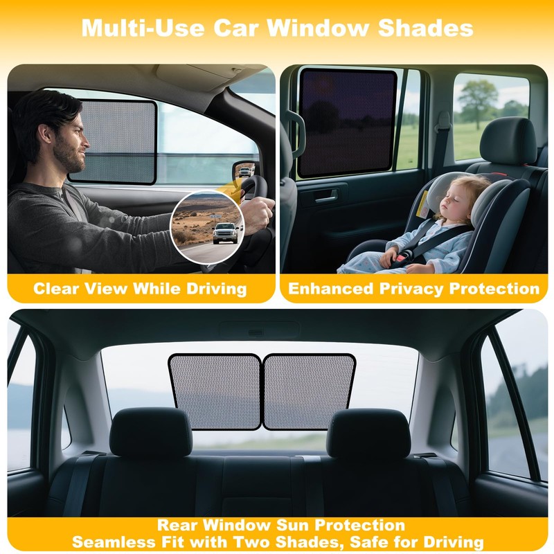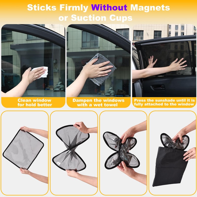 - Stays Put with Static Cling: Forget about falling shades or sticky residue. These car window shades for side window use static cling for tool-free installation—just press onto a clean window and they stay firmly in place, even during long drives or when opening and closing the doors. Please remove the car side window sun shade before raising or lowering the window, otherwise the sunshade will be damaged