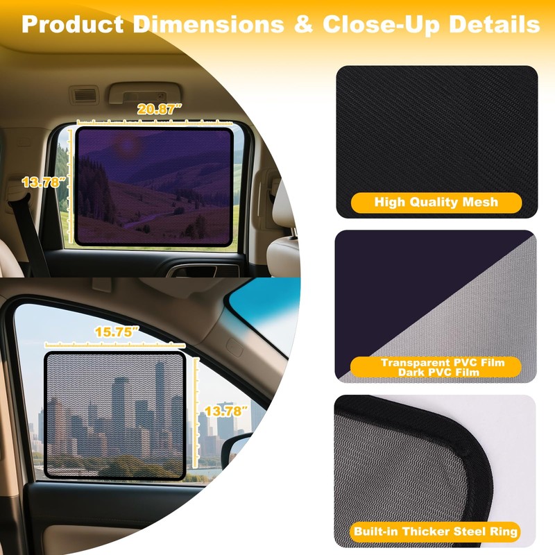 - Enhanced Privacy & Heat Reduction: The larger semi-transparent car privacy window covers provide stronger sun and heat protection, ideal for passengers in the rear seat or for parking. They also boost privacy, making it harder for others to see inside your vehicle