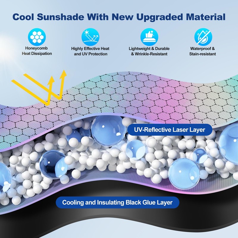 - Laser Honeycomb Cooling Technology: Our car sun shade windshield is made with innovative laser honeycomb material, which not only gives your car a stylish, eye-catching look under the sun but also reflects over 99% of UV rays and heat. This helps keep your car cooler, protecting your seats and dashboard while reducing the need for air conditioning in the summer