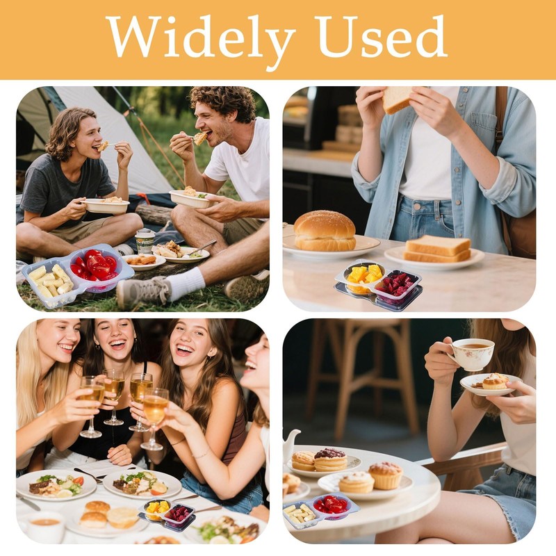 - 【Product Details】You will receive 10 pcs snack containers with lids, each with a double grid design, measuring 14*8.5*2.5cm /5.51*3.34*0.98in. Different family members can have their own exclusive sauce boxes, which are clean and hygienic. The abundant quantity provides you with ample choices, allowing you to enjoy more convenience and fun in cooking and dining.