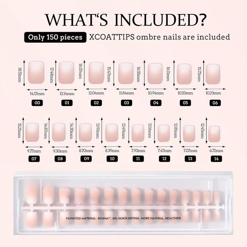 - IDEAL FOR OMBRE NAILS MANICURE: Only 150pcs ombre nails are included. XCOATTIPS(top coat required) bring you netural colors and classic designs. Get ready for with one bulider gel and one top coat, then you can create your unique design in 10 mins.