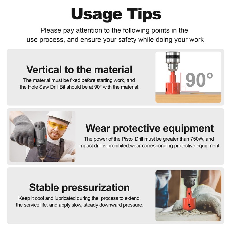- Warm Reminder One: The material must be fixed before starting work, and the Hole Saw Drill Bit should be at 90° with the material,Do not tilt the drill bit in the center. While using, Larger openings and harder materials require slower speeds. For thickness over 10mm, remove the spring on the positioning drill.Use an electric hand drill with power above 750W; impact drills are prohibited