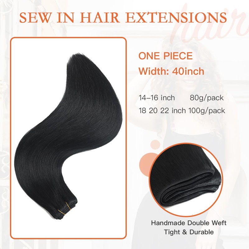 XDhair Weft Hair Extensions Real 22inch 100g Jet Black Sew in Extension Double Weft Remy Weave Bundles Hair Extension Flat Weft Hair Extensions #1 22inch