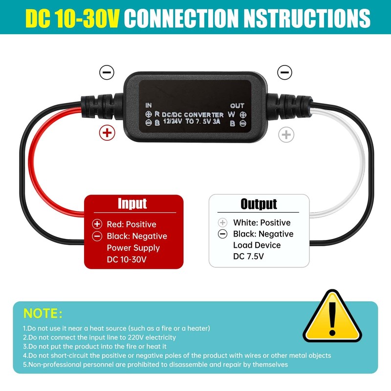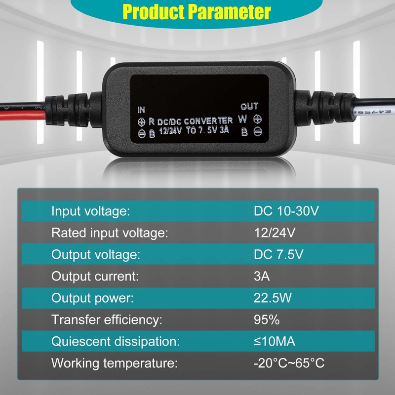 • DC 10-30V to 7.5V 3A Voltage Converter: Converts DC 12V/24V to a stable 7.5V 3A DC output; Output power: 22.5W; Note: The load connected to the output side of the transformer should not exceed the specified maximum load.