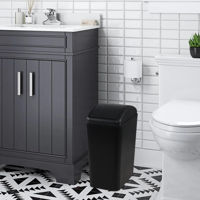 - The swing lid design allows for easy one-handed trash disposal into the bin