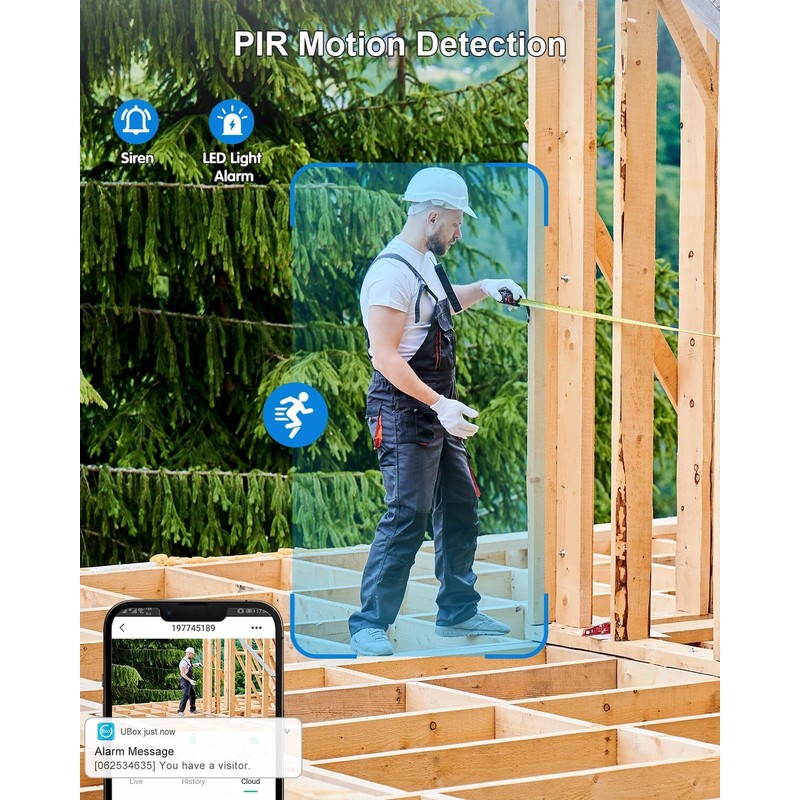 - 【HD Night Vision & Sound & Visual Alarms】This 4G Lte Security Camera Outdoor is equipped with infrared LEDs that work even in total darkness. When this Cellular Security Camera Outdoor detects an intruder at night in the dark, the LED spotlight automatically lights up and an audible alarm sounds to scare the intruder away. All videos can be played back or downloaded directly via the Ubox APP.