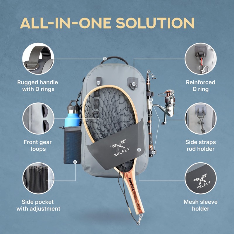 Xelfly - Waterproof Fishing Backpack with Rod Holder, Inflatable Air Valve, Padded Waist Straps & Gear Loops - Submersible Zipper, Rugged Top Handle, Adjustable Attachments (Gray)