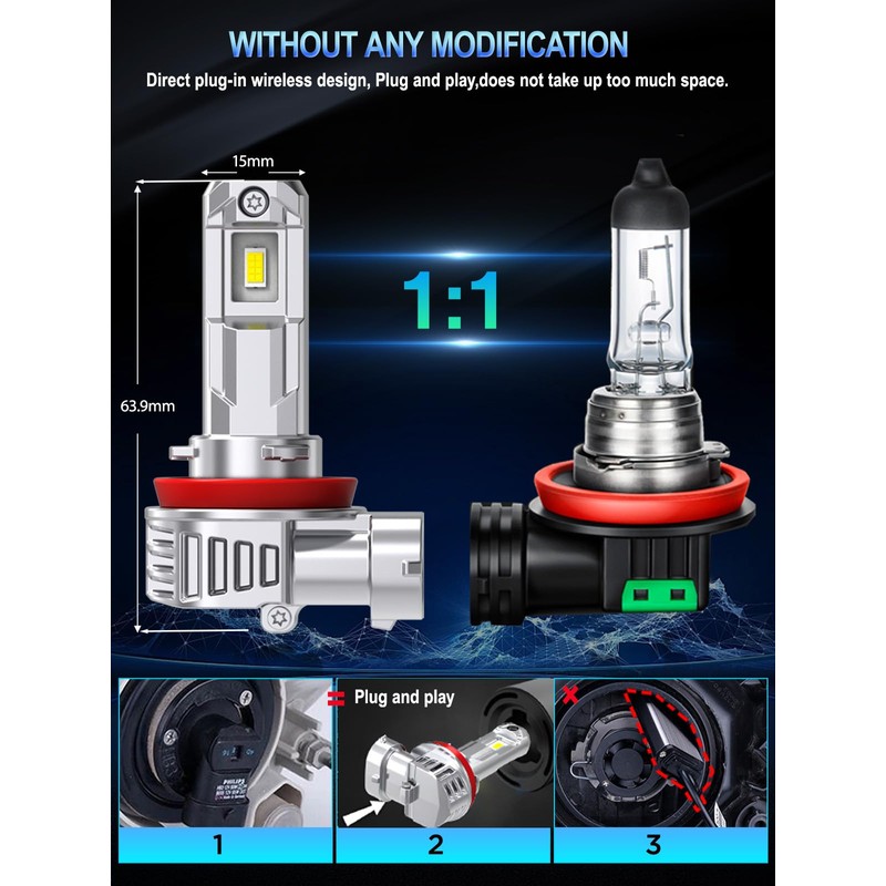 - Mini design: H11 LED 6500K DC9-24V (2 pieces) Plug and play connection to the original bulb. Easy installation.Make sure this plug fits your car model before purchase. If there is no way to confirm it, please feel free to contact us.