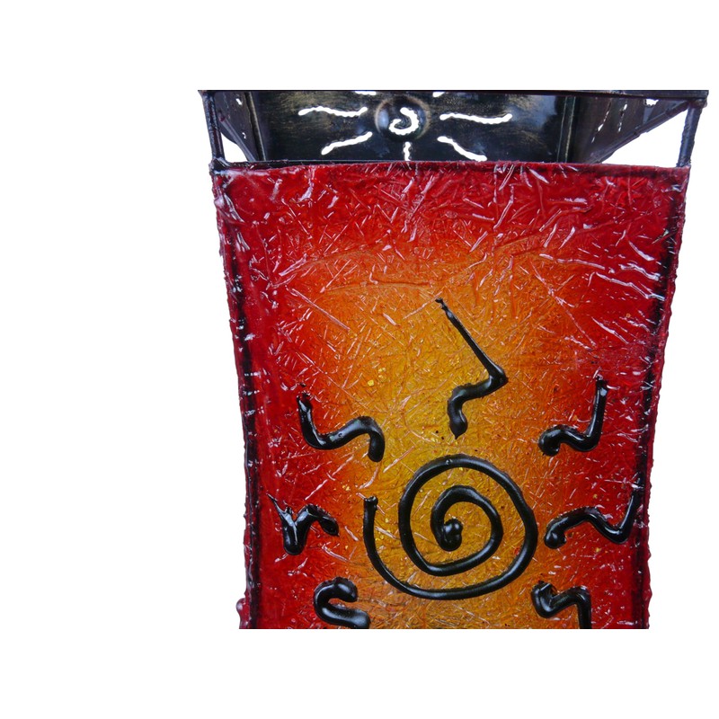 Also looks good as a bedside light: this approx. 30 cm high lamp emits warm, soft light and is also very decorative. The sun motif is lavishly used, on the metal bands at the top and bottom, as well as on the yellow-orange-red resin discs, which are responsible for the luminosity. An airy, light, summery lamp that is made in Bali as an artful handwork.