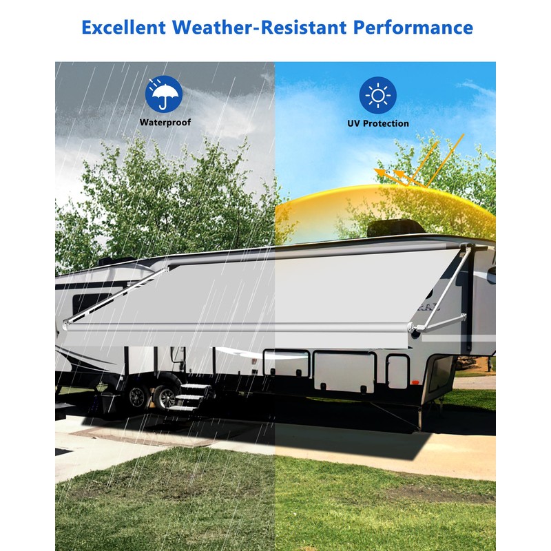 - WEATHER & COLD CRACK RESISTANT: The heavy-duty RV canopy is constructed of 1000D PVD fabric with SPF 50+ sun protection. It protects you and your loved ones from harmful UV rays. Its 100% waterproof design, enhanced by advanced waterproofing technology, provides reliable protection from rain. Even in extreme winter conditions with temperatures as low as -30F, this RV awning canopy remains flexible and crack-resistant, ensuring durability and longevity in all climates.