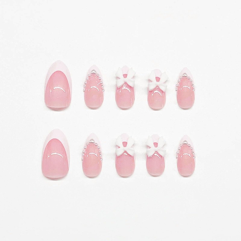 Xenophoer White French Tip Almond Medium Fake Nails with White Pearls Bow Designs Pink Full Cover Glue on Press On Acrylic False Glossy Stick on Nails - 24pcs
