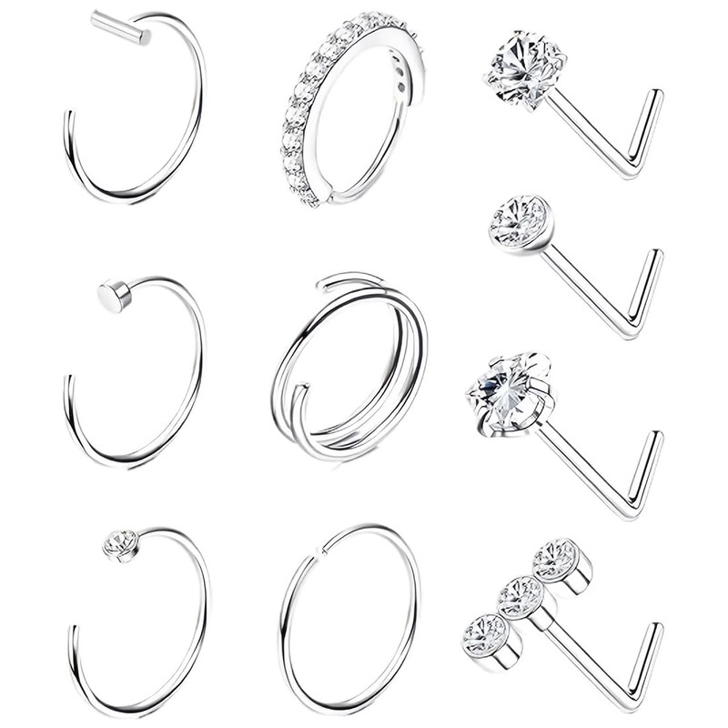 - Nose piercing jewellery styles: you will receive 10 nose piercing rings and earrings in different styles, 1 piece C-ring with flat back, 1 piece small loose gemstone ring, 1 small open ring; 1 double layer ring, 4 L-shaped nose studs.