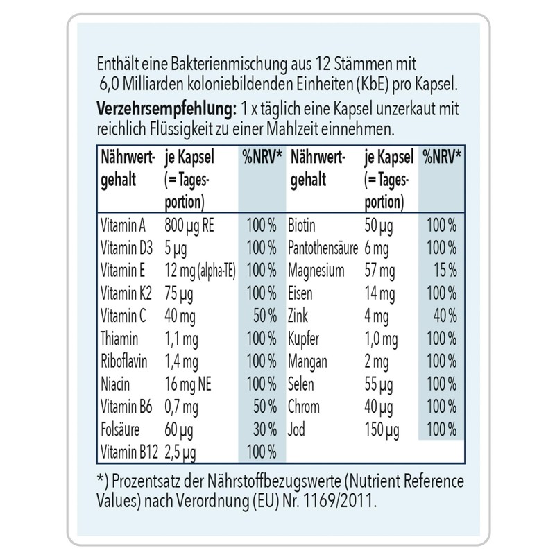 - 12 ausgewählte Stämme mit 6 Milliarden Lebendkulturen (KbE) pro Kapsel sowie 21 Vitamine, Mineralstoffe und Spurenelemente - jeden Tag!