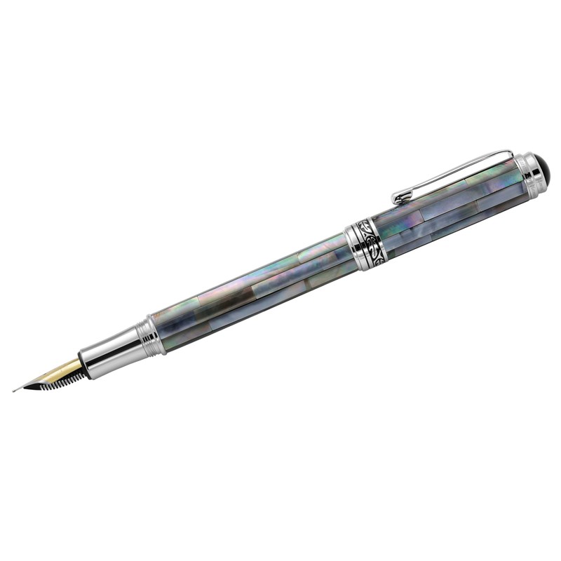 Xezo Maestro Fountain Pen, Medium Nib. Handcrafted with Black Mother of Pearl Inlay. Platinum Plated. Limited Edition, Serialized. No Two Alike