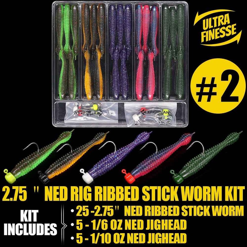 - MONEY-SAVING KIT--Ideal for bass, but also effective for panfish and trout to white bass and drum. Inside this money-saving, 35-piece assortment of all classic-color XFISHMAN Ned Rig Kit, you'll find 25 pcs 4" NED RIBBED STICK WORM. and 5pcs 1/10 oz. Finesse Offset Weedless Mushroom Jighead, 5pcs 1/6-oz. Finesse Offset Weedless Mushroom Jighead.