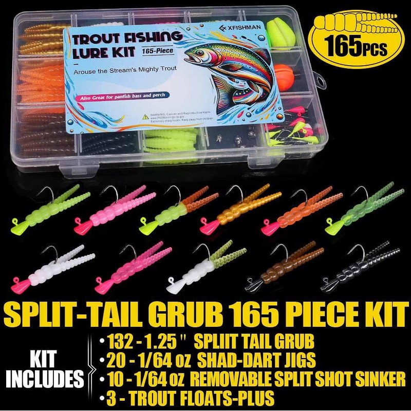 XFISHMAN-Trout-Fishing-Lure-Kit 165-Piece Creek & River Fishing Set with Split Tail Grub Worms, Shad Dart Jig Heads, Floats & Sinkers Ideal for Seasonal Trout Crappie Panfish
