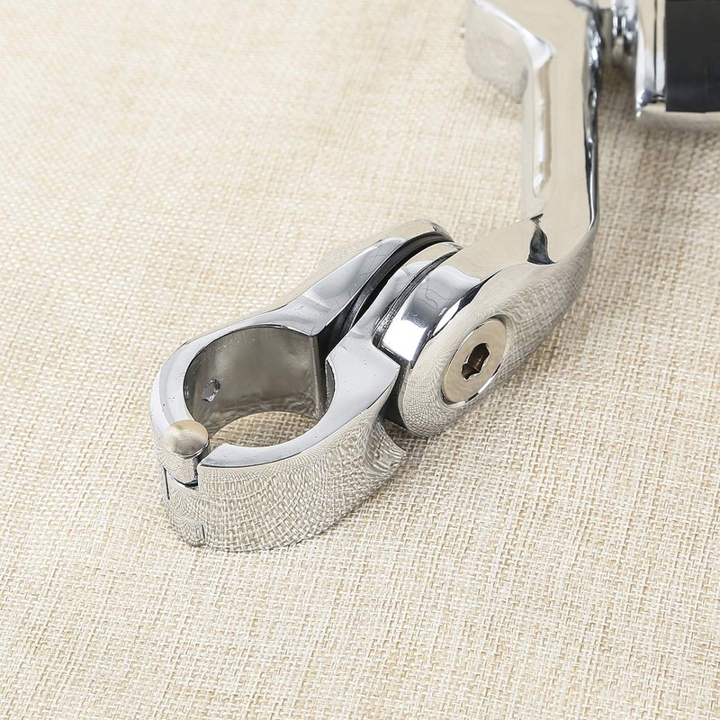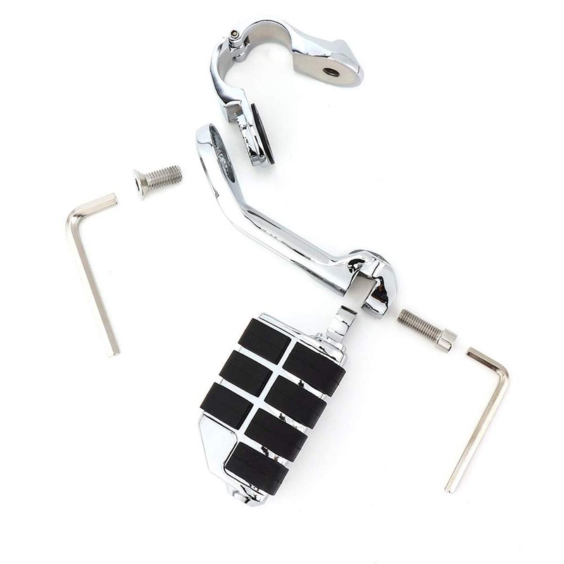 - Mounting clamp is 360 degree adjustable, and firmly grips the engine guard, and the locking design secures the peg at the desired angle. Skid proof engraved durable rubber surface.