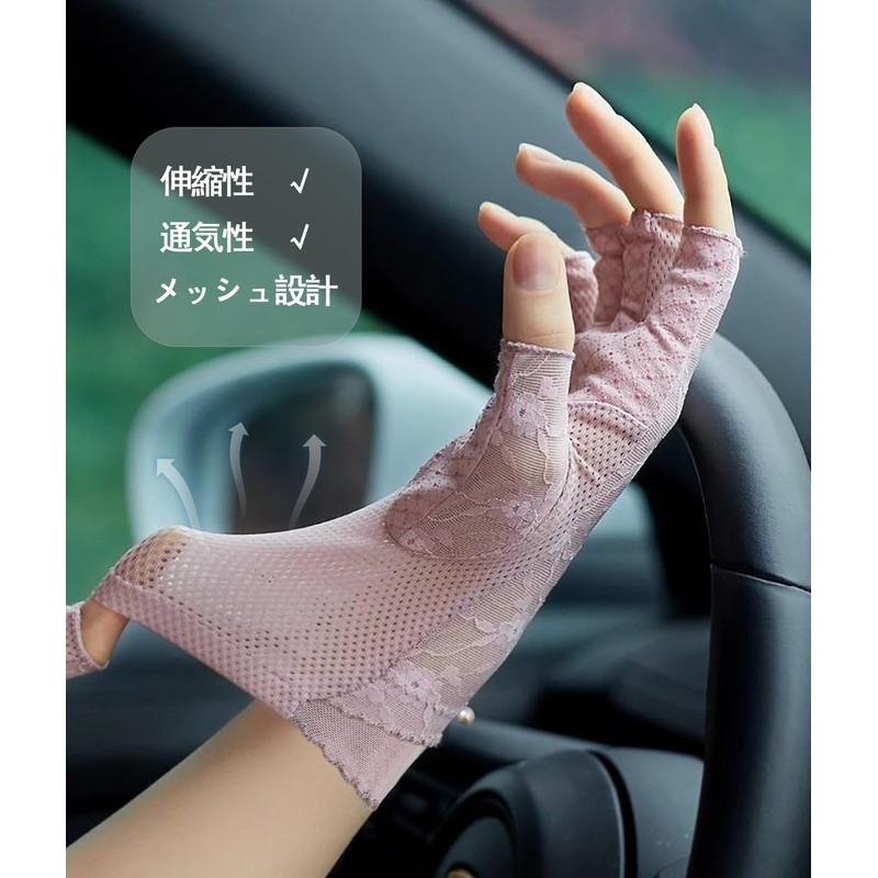 XFONZYUN Women's Gloves, Lace, Fingerless, UV Protection, Sunscreen, Anti-Slip, Half Fingering, Cooling Sensation, Smartphone Compatible, UV Protection, Driving, Bicycle, Commuting, Thin, Pink