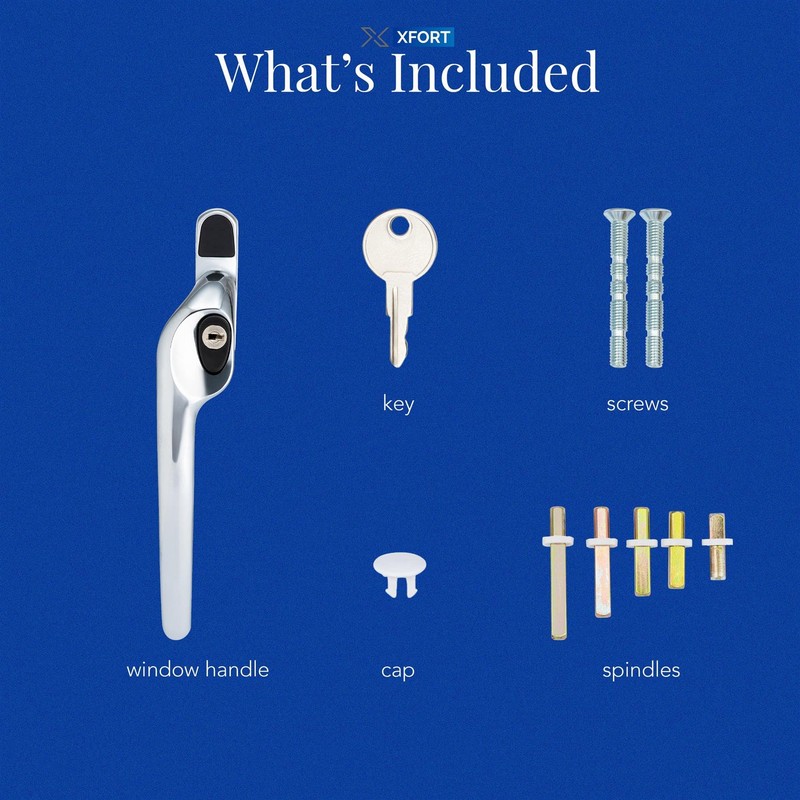 - FITTINGS: The upvc window handle comes with multiple spindle lengths (10mm, 15mm, 20mm, 30mm and 40mm) to suit any window thickness. The cranked double glazing window handles include screw hole covers, two adjustable screws and a keyhole cover for a neat finish.