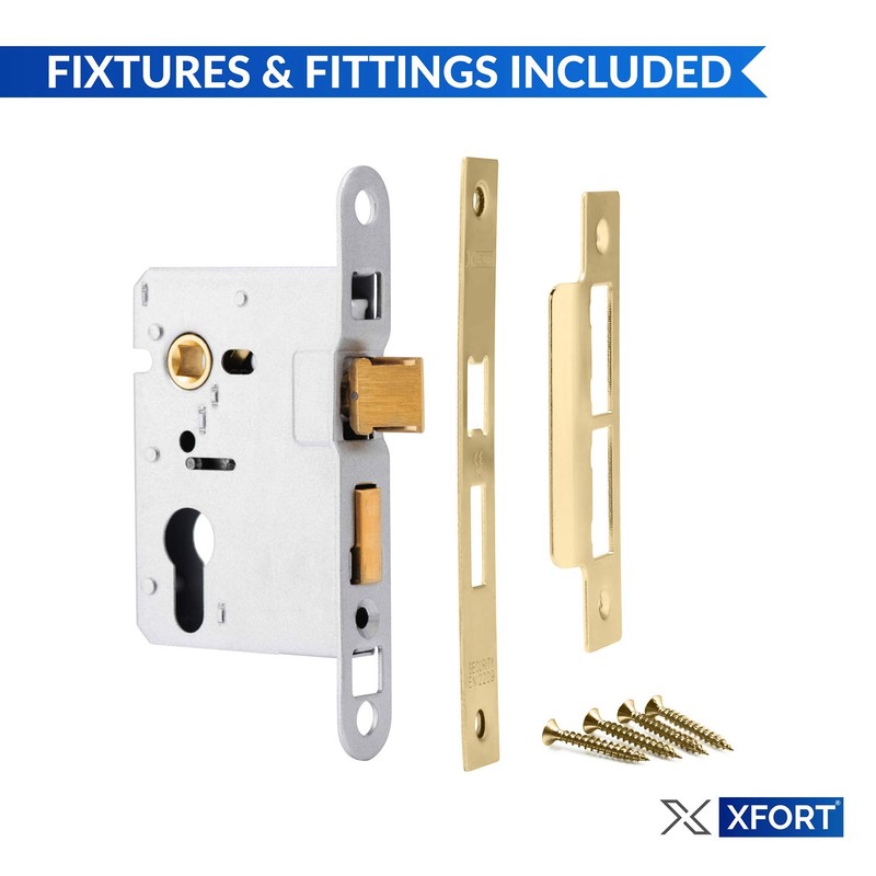 The XFORT euro sash lock is a mortice locking mechanism for external and internal wooden doors. It features a latch and bolt for use with door handles where euro cylinder key locking door security is needed. You will need an appropriate euro cylinder to operate the lock. The lightly sprung latch will retract fully with only 25-30-degree depression of a lever or knob handle, making opening and closing doors effortless. These euro sash locks are finished in elegant polished brass that complements your door handles and other home decor. This ensures they are aesthetically pleasing while maintaining a consistency with other fixtures and fittings. The face plates are supplied with a protective removable film which ensures they are not scratched or marked during installation.