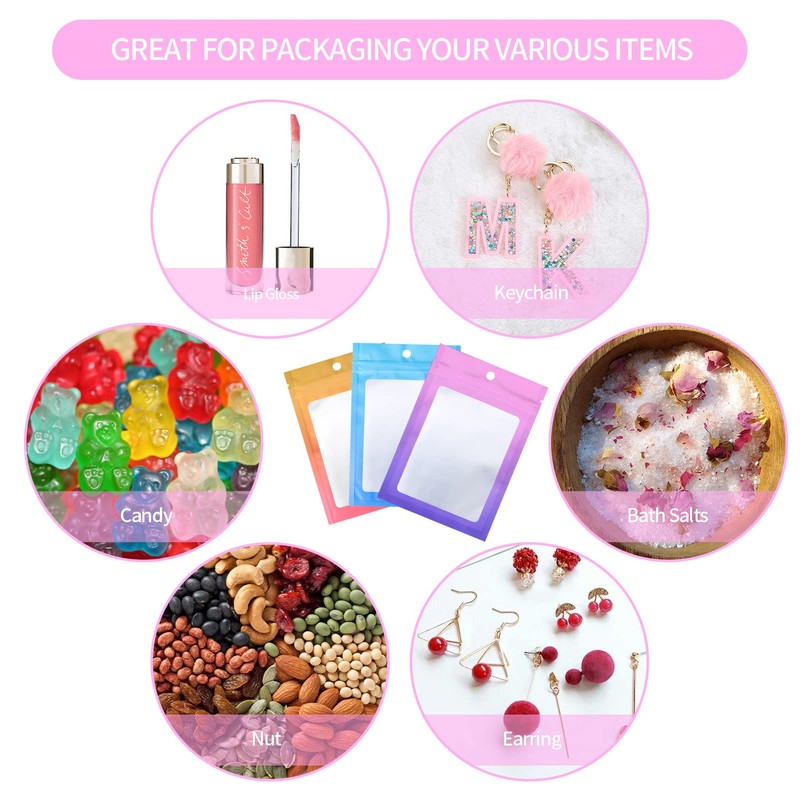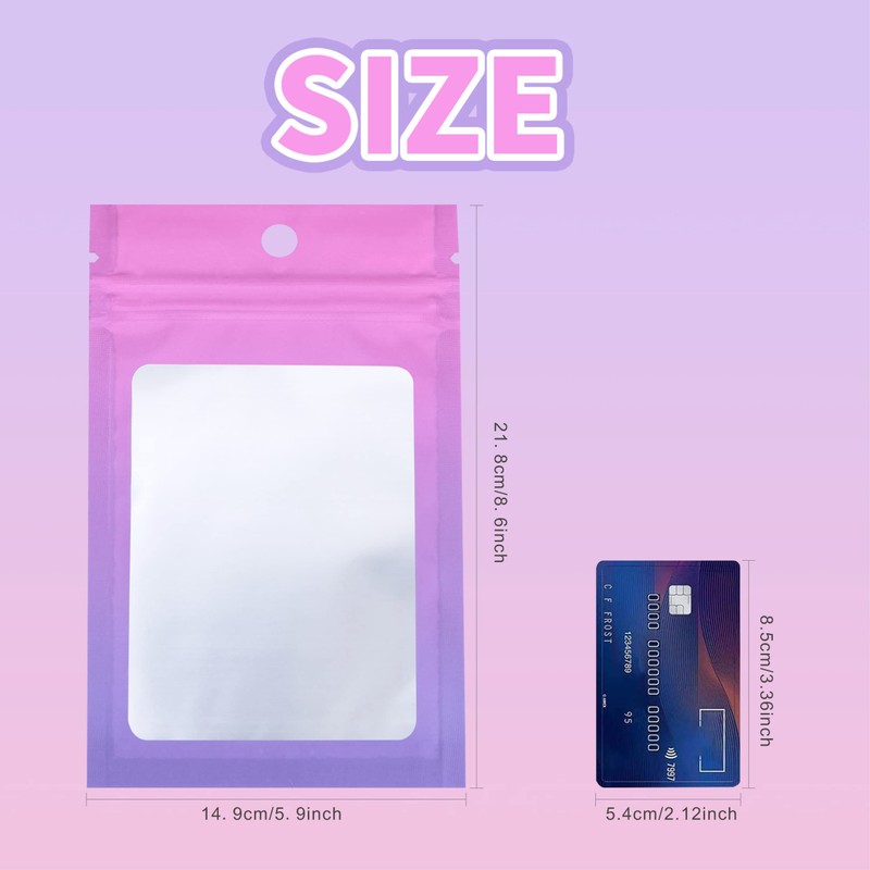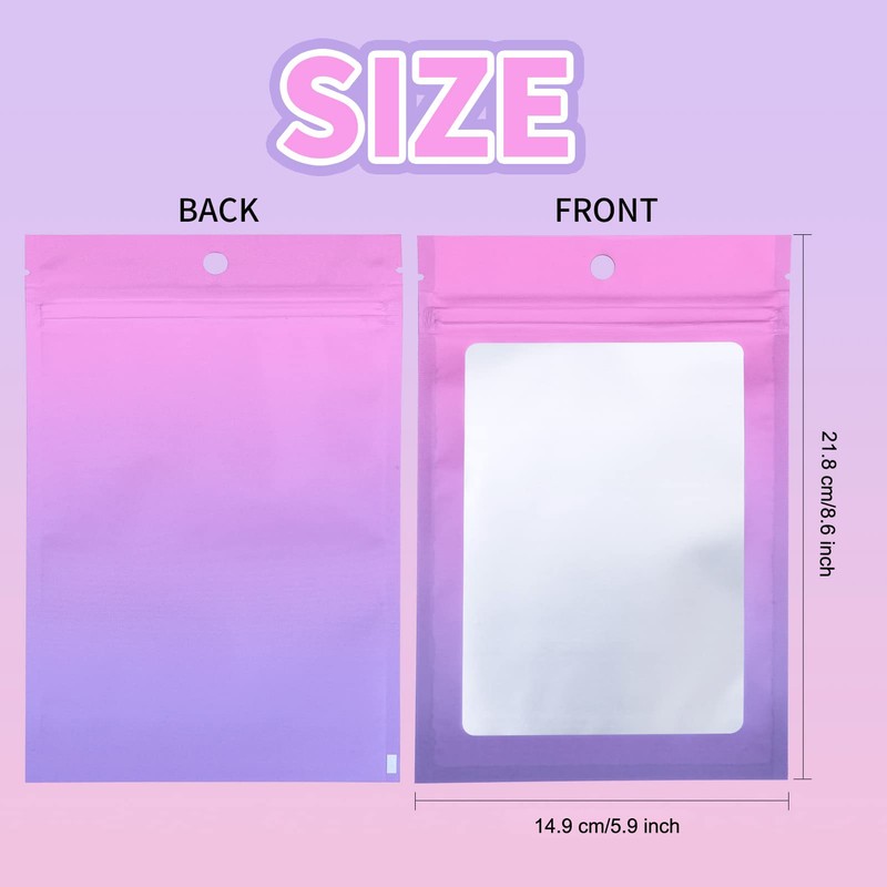 - 【Size】 - The gradient purple foil pouch bags with clear window’s size is 5.9 × 8.6 inches and please note the available size is 5.5 × 7.3 inches.