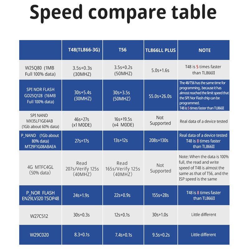 - With 40-pin industrial high-quality ZIF socket (pluggable/replaceable), the latest model T48 (TL866-3G) programmer is the improvement of TL866II Plus programmer. Based on 32-bit MCU with 120MHz and 4-layer PCB design, this professional T48 programmer supports high-capacity NAND EMMC up to 256GB and programming speed is much higher.