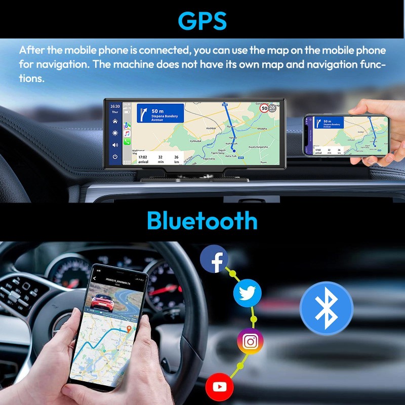 【Extender Function】Other function you may need: mirrork and airplay-it means the wireless carplay screen can replace your phone's view thoroughly,then your kids can watch movies or matches on Youtube or TIKTOK from a bigger and clearer 10.26 inch HD IPS Screen on long trips. Bluetooth and voice control-let you make calls hands-free,supports voice control via siri or google assistant. GPS Navigation-you can navigate through your HD car display screen after connection your phone.