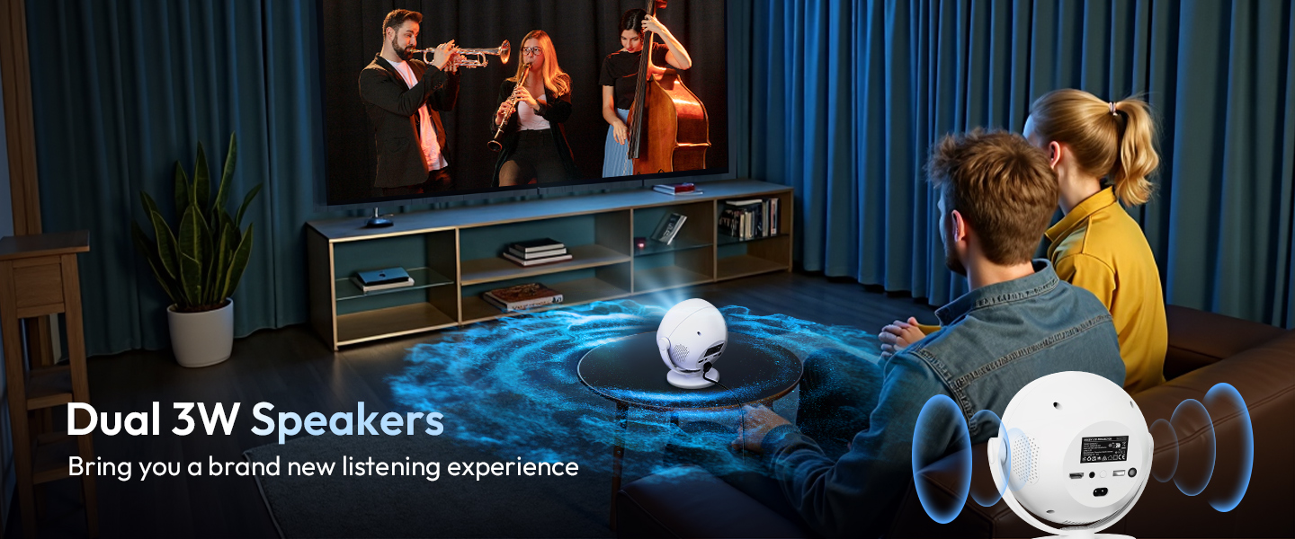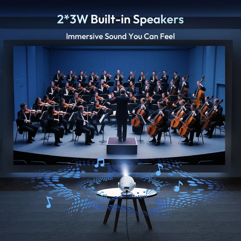 This mini wifi projector built-in 2*3W stereo speakers with a HiFi system that can provide a great listening experience: an ultra clear and powerful sound. Then you do not need to buy additional speaker. You can enjoy home theater with your family. This projector also with BT 5.0, which allows you to connect ideal audio equipment, can support stable connection with multiple BT speakers.