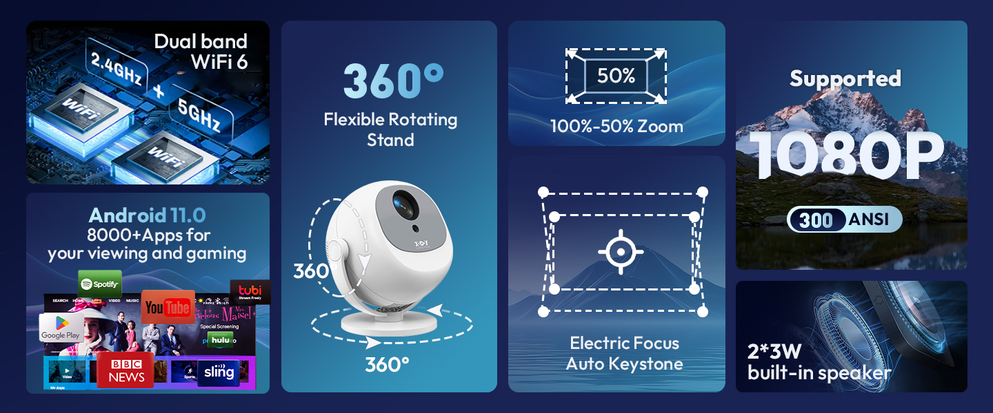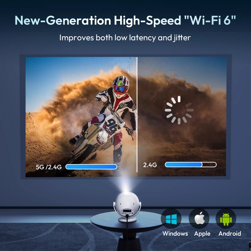 WiFi Projector with WiFi 6 and bluetooth 5.2 supports Dual-Band WiFi connection, Whether you're watching a high-resolution film, listening to high-quality music, or playing games, speed and stability are what you can expect. With Bluetooth, this Bluetooth projector allows you to easily connect your ideal headphones, speakers, or other audio equipment. Projector Chrome cast built-in.