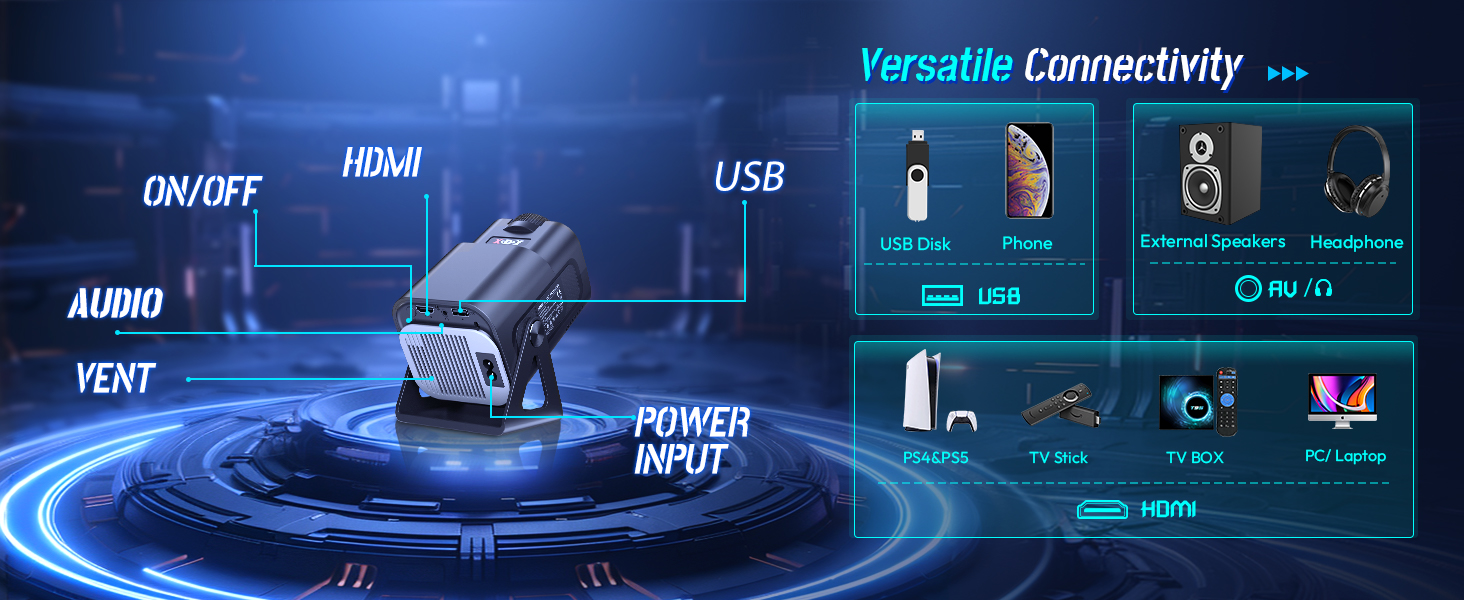 🔥【WiFi 6 & BT 5.0 Video Projector】Portable Projector uses the latest WiFi6 technology, higher transmission rate and lower latency than 5G, a few seconds will be wirelessly synchronized to get a big screen. No additional adapter required. Built-in BT 5.0 chip, the projector allows you to connect the ideal Bluetooth speaker/headphone at any time and save every detail of the sound effect to offer you different sound scenes.