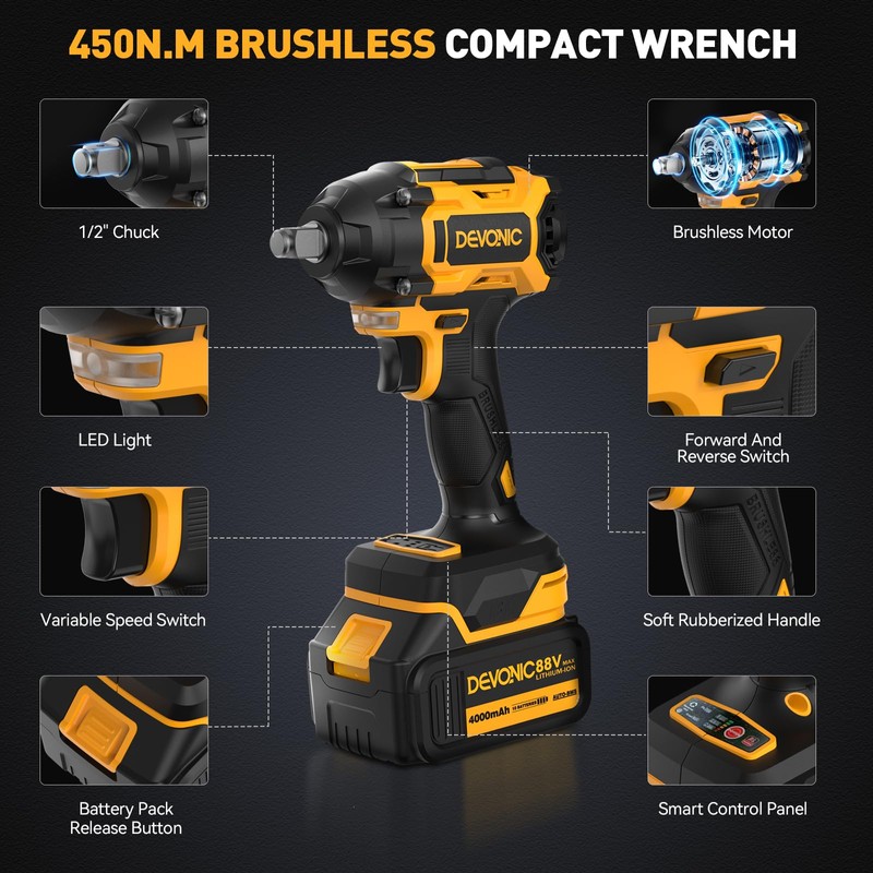 XGOLD DEVONIC Cordless Impact Wrench,Brushless Impact Gun (450Nm)