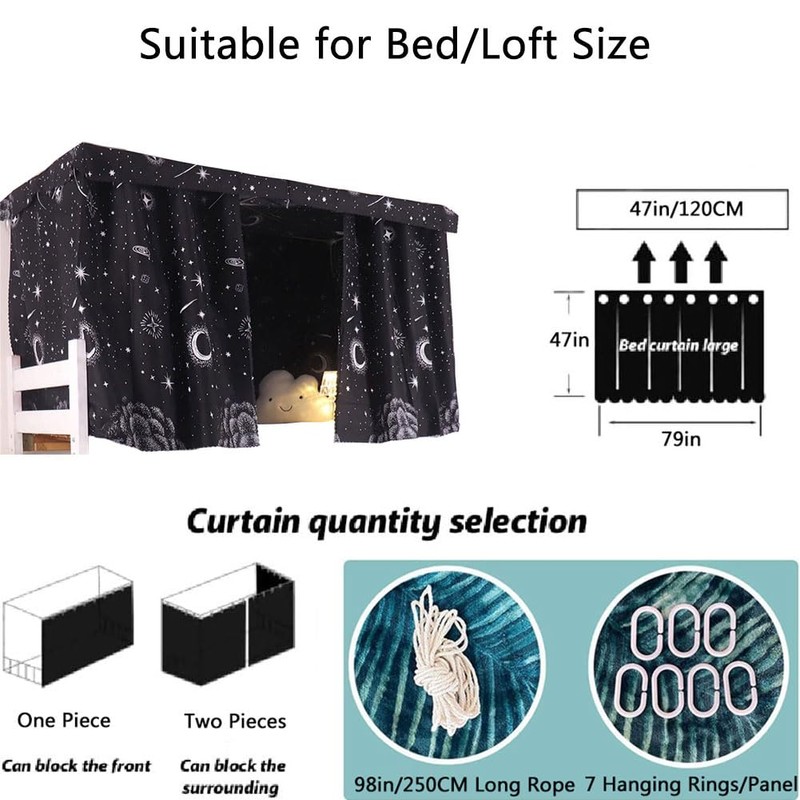◇78.7*47 inches/200*120 CM(L*W). Included two pieces bed curtain,can cover both sides and front, the recommeded loft height is 45-50in