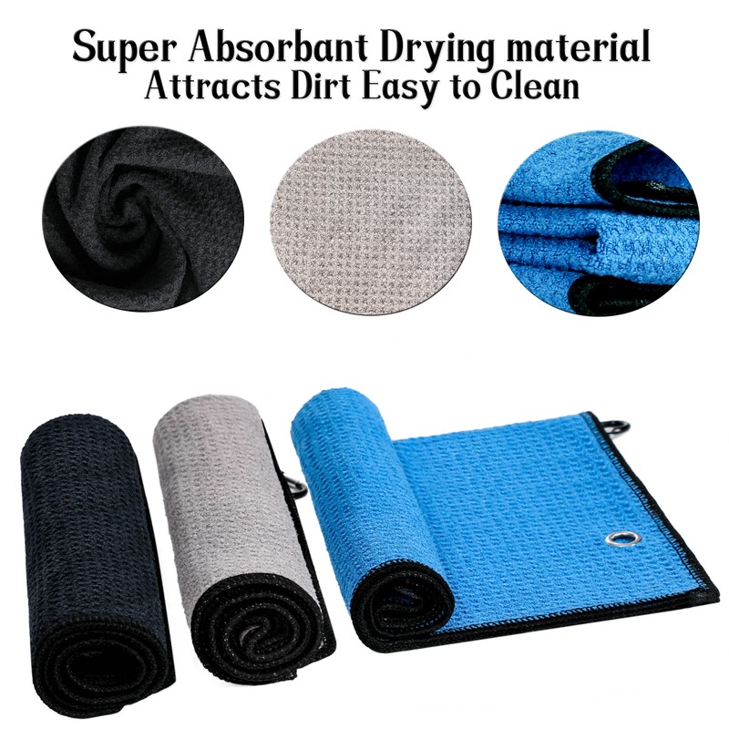 - CLASSIC COLORS :In this golf towels set, we provide 3 classic and not out of date Colors for you-Black(Black Edging) + Gray(Black Edging)+ Blue(Black Edging),You can choose the matching color of golf towel for golf bags, club suit and your favorite team.