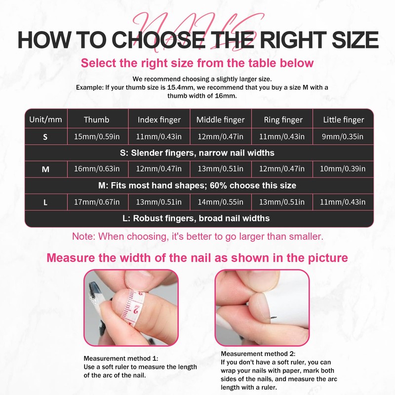 - 【Perfect Fit】 Each handcrafted artificial nail is designed to perfectly fit your natural nails. We offer three sizes (S/M/L) to ensure every customer finds their perfect “nail surface.” The set also includes all the tools needed for application, allowing you to create beautiful nails on your own.