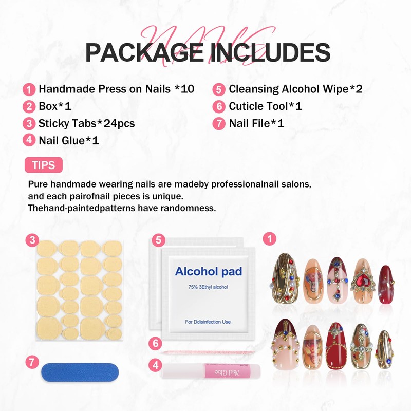 - 【100% Handmade Nails】Each handcrafted nail is a one-of-a-kind masterpiece. Designed and crafted by skilled artisans using advanced 3D technology. Free from irritating chemicals, safe and harmless to natural nails.