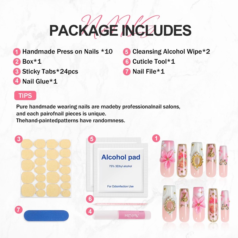 - 【100% Handmade Nails】Each handcrafted nail is a one-of-a-kind masterpiece. Designed and crafted by skilled artisans using advanced 3D technology. Free from irritating chemicals, safe and harmless to natural nails.