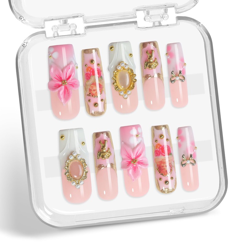 XGV Long Handmade Press on Nails - 3D Press on Nail With Flower, Pretty & Reusable for Daily Wear