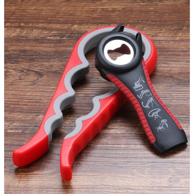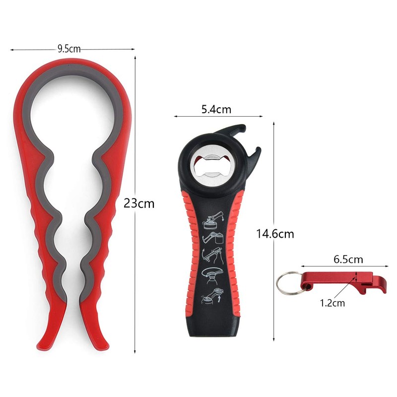 - Package includes: 1 x 5-in-1 bottle opener, 1 x 4-in-1 jar opener and 1 x mini key ring bottle opener
