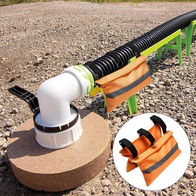 Secure your RV sewer connections with our durable weight bags. The bright orange color with reflective strips ensures visibility day and night, while preventing accidental spills and hose movement.
