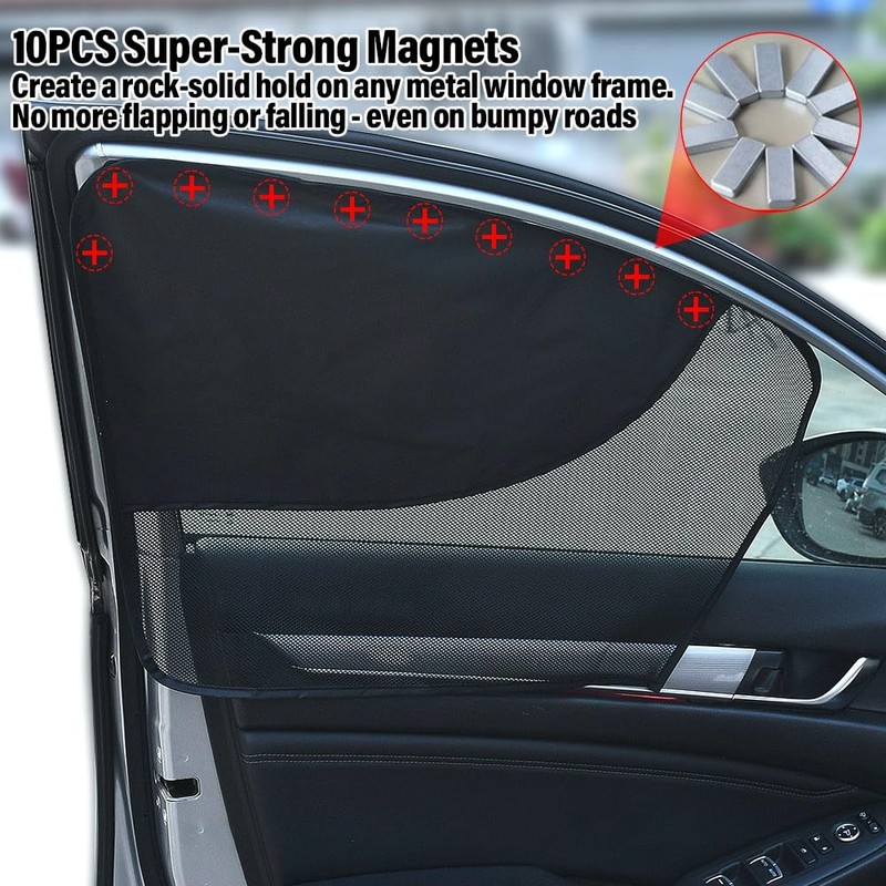- Half-Blackout Design: The side window shade come with a unique double layer design. The upper part of the shade is made of opaque black fabric to effectively block strong sunlight, while the lower part is a translucent mesh that ensures clear visibility without obstructing the view