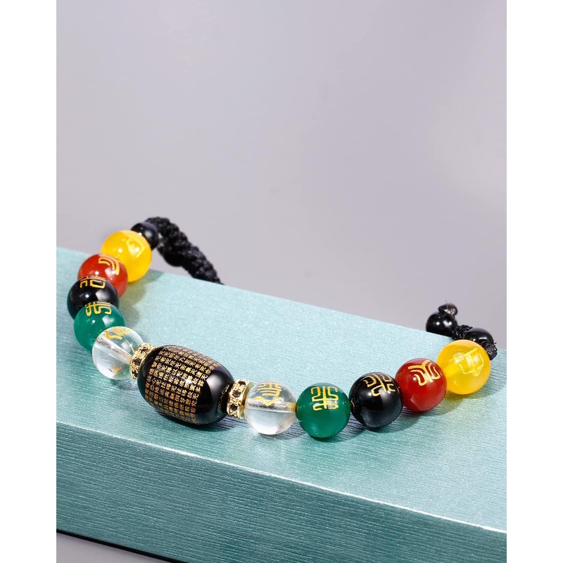 - ▲Material:natural agate, "gold, wood, water, fire, earth"are carved on the colored agates, the six-character mantra is carved on the black agate, metal charm: 14k gold inlay black CZ, total weight: 24g(0.85oz), adjustable length: 42-70cm, (17"-28");