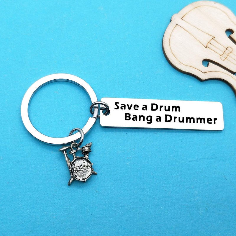- Drummer Keychain: Engraved with "Save A Drum Bang A Drummer" . Perfect drumming gift for a drumming teacher or drumming instructor or student or music lovers.