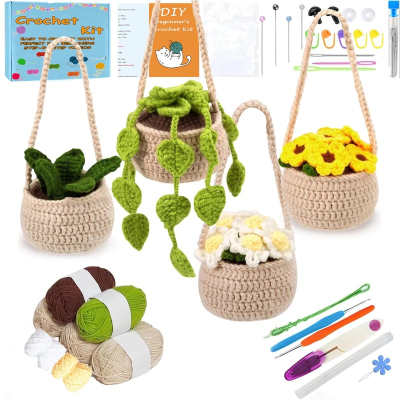 XIANFANG 4 PCS Car Hanging Basket Hanging Plant for Car Decor Crochet Starter Kit Cute Potted Plants Crochet with Step-by-Step Video Tutorials Complete Crochet Kit for Beginners