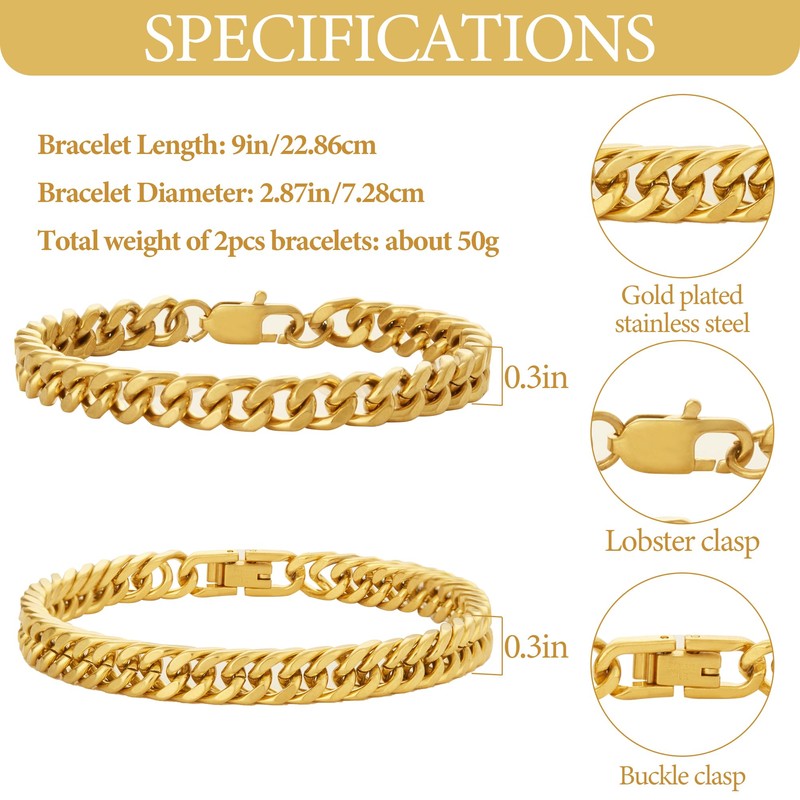 - [MENS BRACELET SET] - These 2 men's bracelets are made of high quality gold plated stainless steel, sturdy and durable, will not fade, rust, or lose its luster,simple clasp design for easy wear,so you can wear them with confidence!