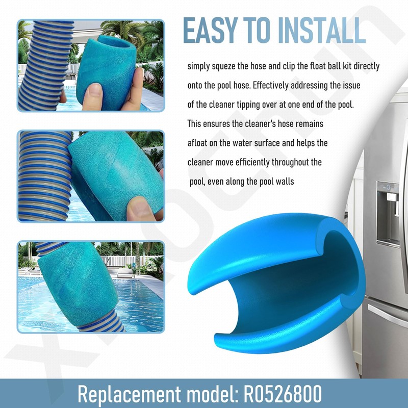 - Easy to install—simply squeze the hose and clip the float ball kit directly onto the pool hose. Effectively addressing the issue of the cleaner tipping over at one end of the pool. This ensures the cleaner's hose remains afloat on the water surface and helps the cleaner move efficiently throughout the pool, even along the pool walls