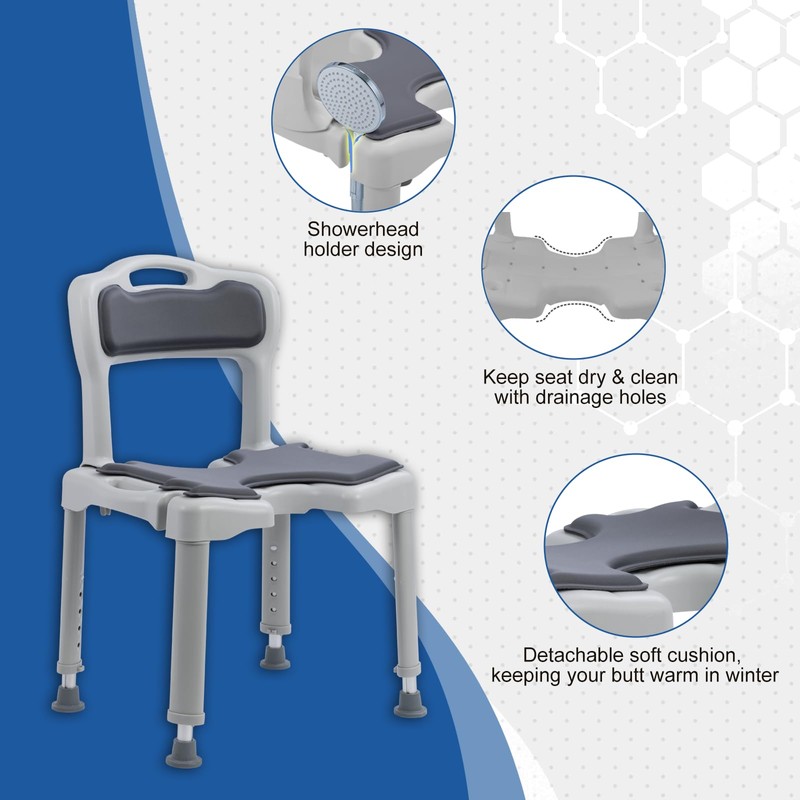 - 【Ergonomic Design for Maximum Comfort】Designed for enlarging bathing comfort, Our shower chair features an extra wide U-shaped seat, ergonomic backrest, soft padded cushion, drainage holes, and a built-in showerhead holder, providing pleasure bath experience for seniors and people with limited mobility.