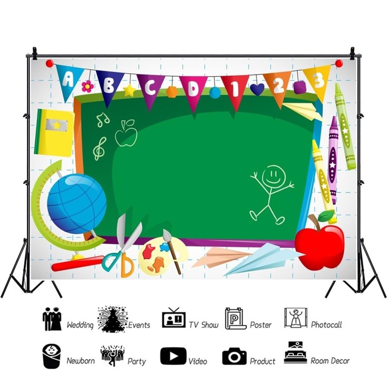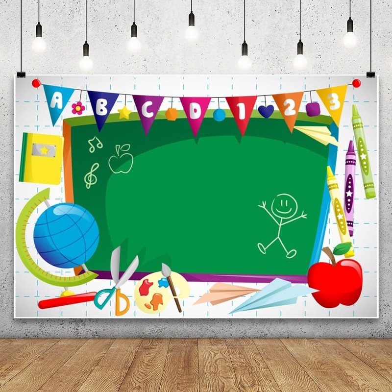 Xiaoterna 7x5ft Back to School Backdrop Watercolor Chalkboard Pen Paper Airplane Globe Photography Background Welcome to Kindergarten Backdrop Student Child Portrait Photo Studio Props