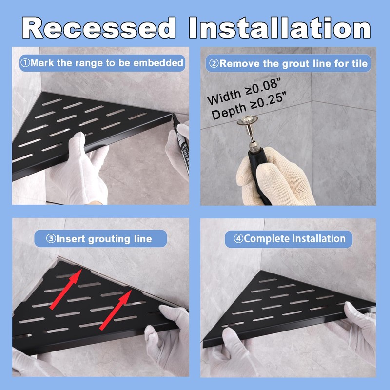 - 【Designed For Tiled Wall】These recessed shower shelves have installed in grout line between tiles, Before installation, need to remove the cement paste from the grouting line. Permanent installation making the floating shelves more secure and less prone to detachment.Please note that shower caddy are only for 90°corners wall.