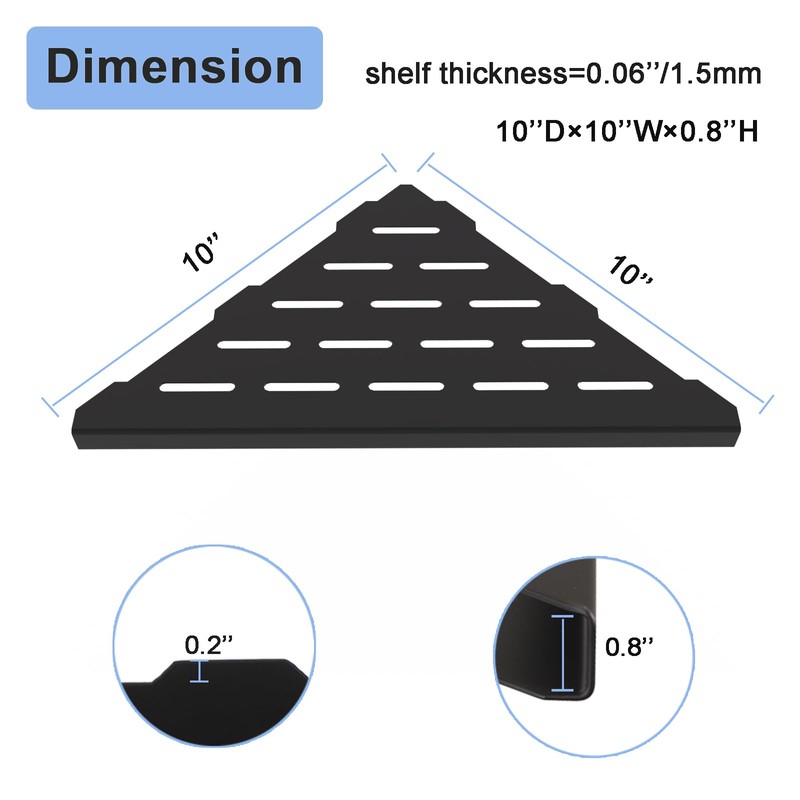 - 【High quality Material】This corner shower caddy is premium grade SUS304 stainless steel, rust, scratches and corrosion resistant. Hollowed bottom, drips fast and is easy to dry, no resulting water stains, keep your stuffs tidy and clean.With 1.5 mm thickness can hold up to 15 pounds per shelf.