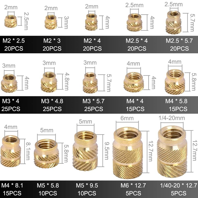 - ✅[Package Contents]: 250 pcs screw insert (Size: M2 M2.5 M3 M4 M5 M6 + 1/4-20 x 12.7 inch screws) See Figure 2 for the number of insert nuts in different sizes. 1 x Tweezers